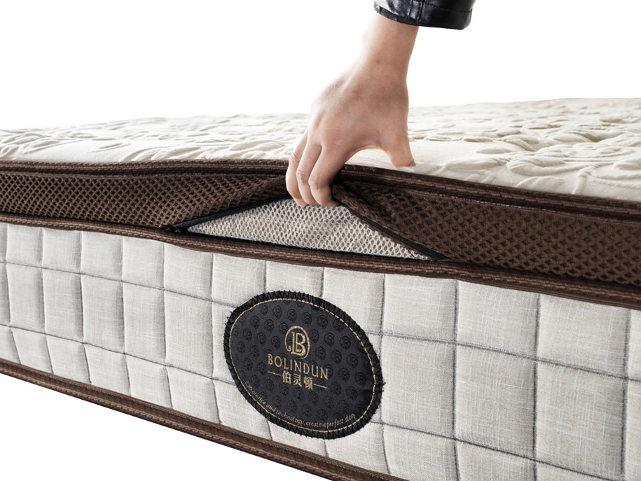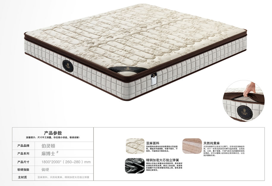 功能及卖点:1、选用德国技术高碳锰钢线2.3线3.5芯736个独立弹簧系统,高17CM,含边缘加粗的弹簧及高密度强化围边海绵,防止床边塌陷,增加有效睡眠面积;2、优质高密度环保热风棉,强力平衡弹簧受力,保护床网不变形3、垫层为4CM的纯黄麻,黄麻功能(A、防螨防虫:天然环保:(独特S型植物弹簧)4、采用了亚麻面料(A、无静电、散热快;B、不起球、耐酸碱